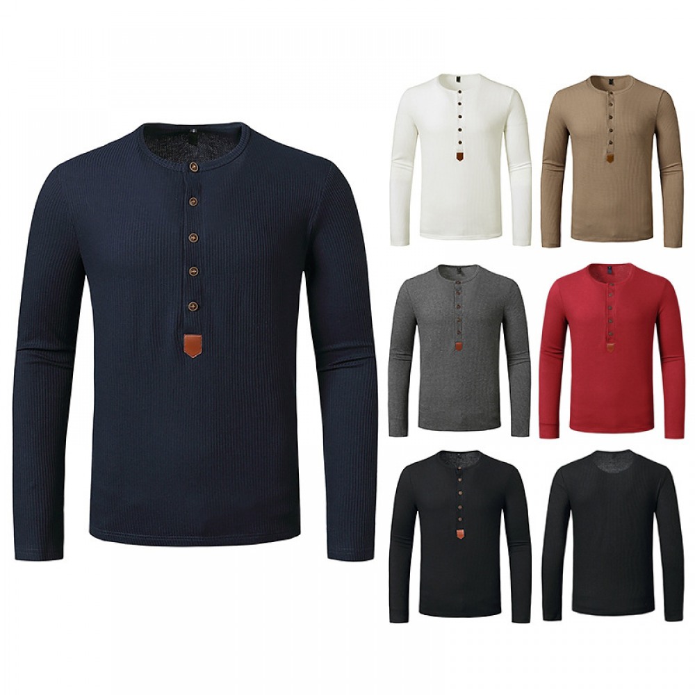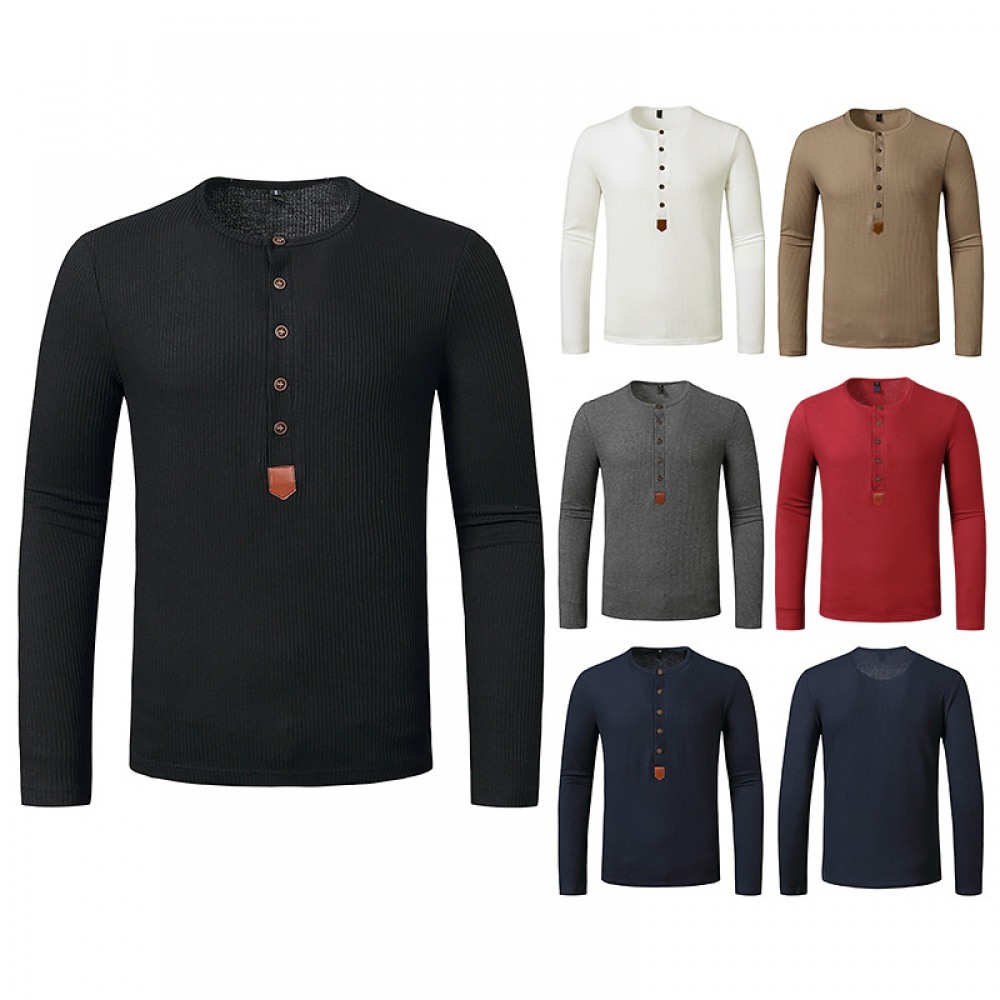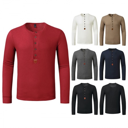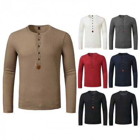 Men's Autumn and Winter Long-Sleeved Bottoming Waffle Henry Collar T-Shirt